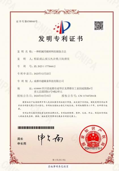 成都中超碳素科技有限公司取得機械用碳材料制備兩項專利